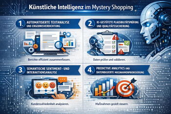 Der Einsatz von Künstlicher Intelligenz im Mystery Shopping ist keine Zukunftsvision mehr, sondern in ausgewählten Prozessschritten bereits produktiv etabliert. Entscheidend ist dabei, dass KI weder Testkäufer noch fachliche Bewertung ersetzt. Sie unterstützt strukturierte Qualitätssicherung, beschleunigt Auswertungsschritte und erhöht die Steuerungsrelevanz der Ergebnisse. Ziel ist eine methodisch saubere Verdichtung großer Datenmengen, insbesondere bei umfangreichen Standortnetzen, hohen Fallzahlen und komplexen KPI-Systemen.